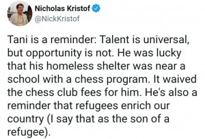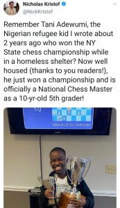 Tani Adewumi, a Nigerian refugee in the US, has won another chess competition to officially become a national chess master at 10.Tani, whose family fled Nigeria over Boko Haram crisis, came into limelight in 2019 after winning the 2019 New York chess championship while living in a homeless center on religious asylum.His story touched hearts and a GoFundMe page was created for him. A total of $254,448 was raised, which helped the chess prodigy and his family to move into an apartment.Tani’s success continued and it was announced earlier in the year that he will compete in the Chess Club of Fairfield County (CCFC).The competition held on May 1 and Tani snagged the national title.Nicholas Kristof, a columnist for New York Times, confirmed the latest feat on Twitter.According to the US chess federation, the national chess master title is for any player who reaches a “2200 rating”.The US body overseeing chess competitions adds that “Less than one percent of rated players hold the title. An Original Life Master is a National Master who played 300 games with a rating over 2200” points amassed from games.
