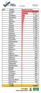 The health agency gave a breakdown of the new cases across states as follows; Lagos-824, FCT-246, Plateau-166, Kaduna-128, Ogun-76, Nasarawa-74, Anambra-69, Edo-50, Rivers-45, Ondo-44, Niger-40, Oyo-38, Adamawa-35, Kano-31, Akwa Ibom-27, Gombe-19, Kwara-13, Ekiti-12, Delta-6, Kebbi-6, Bauchi-5, Ebonyi-4, Osun-3, Zamfara-1.