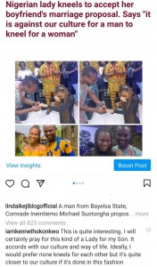 In viral proposal photos shared online, the woman told her boyfriend not to kneel to propose because he is the man of the house and it is against our culture for a man to kneel for a woman.