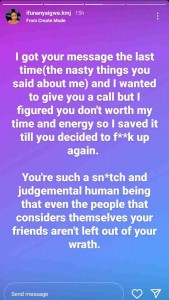 “I got your message the last time(the nasty things you said about me) and I wanted to give you a call but I figured you don’t worth my time and energy so I saved it till you decided to f*k up again. You’re such a sn*tch and judgemental human being that even the people that considers themselves your friends aren’t left out of your wrath. “