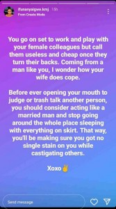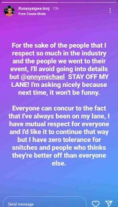 “You go on set to work and play with your female colleagues but call them useless and cheap once they turn their backs. Coming from a man like you, I wonder how your wife does cope. Before ever opening your mouth to judge or trash talk another person, you should consider acting like a married man and stop going around the whole place sleeping with everything on skirt. That way, youll be making sure you got no single stain on you while castigating others.“For the sake of the people that respect so much in the industry and the people we went to their event, I’ll avoid going into details but@onnymichael STAY OFF MY LANE! I’m asking nicely because next time, it won’t be funny.”