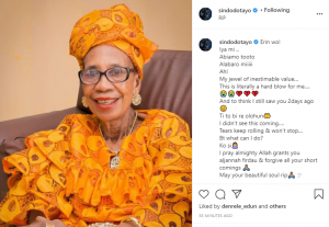 Actress Tayo Odueke aka Sindodo Tayo is bereaved as she has lost her mum.
