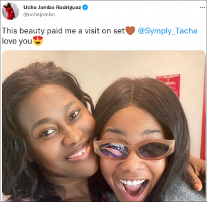 Actress Uche Jombo Declares Love For Reality TV Star Tacha For Visiting Her On Movie Set July 29, 2021 For Online PR / Hype / Music Promotion Call 08074130688 Follow @TrendJamz Big brother Naija star Tacha visited actress Uche Jombo on a movie set and both of them took a snapshot together Entertainment & GistTachaUche Jombo - by Yung Zeelee