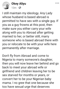 “I still maintain my ideology. Any Lady whose husband is based abroad is permitted to have sex with a single guy. If you as a guy frowns at this post, then make sure you either carry your wife along with you to Abroad after getting married to her, or better still, marry someone who is based abroad there with you or relocate to be with your wife here permanently after marriage,” he said.