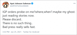 ”IGP orders probe on me?where,when?.maybe my ghost. just reading stories now. Please discard.. There is no such thing.. Bad press really sells fast.”