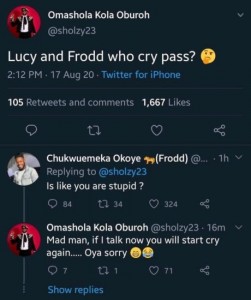 Omashola took to his Twitter handle on Monday to engage followers in a debate where he asked: “Lucy and Frodd who cry pass?”