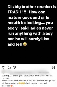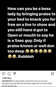 According to the mother of one, who describes herself as a ‘Boss Lady,’ she invited Praise to her bed where they had sex but was disappointed as it only lasted for 5 seconds. She said in annoyance she had to leave the bed to go outside and ‘chill’ as she was disappointed at Praise’s performance.