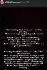 “Na now una dey stay indoors… noooo continue protesting,” she wrote.