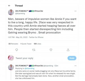 Hours after unfollowing her husband, 2face idibia, Nollywood actress, Annie Macualay has been blasted by medical doctor and sex educator, Dr Penking.