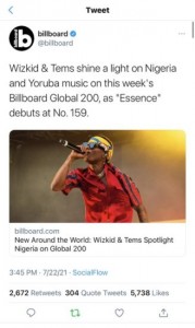 While acknowledging the song in a tweet post by Billboard on their official Twitter page, “Essence” was identified as a Yoruba music.