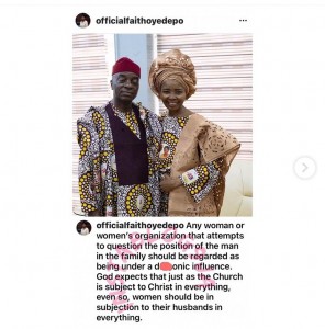 Bishop David Oyedepo’s wife, Faith Oyedepo has said that any woman or women’s organization that attempts to question the position of the man in the family should be regarded as being under a demonic influence.
