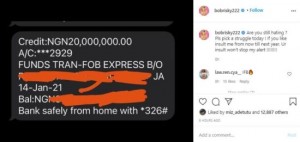 Popular male barbie, Bobrisky has shown off a whopping credit alert of 20 million naira credit from his supposed sugar daddy.