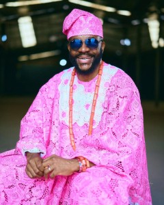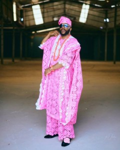 He completed the outfit with coral beads around his neck and wrists, while his dark sunglasses brought a hint of modern cool. His fila, crafted from the same pink lace, is so grand. Black shoes finished it off neatly, allowing the agbada to be the star of the moment.