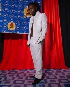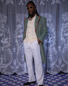 Burna looks extra dapper on the cover, wearing a brown JORDANLUCA set paired with a tie and dye coat from British-Nigerian fashion brand MONAD.