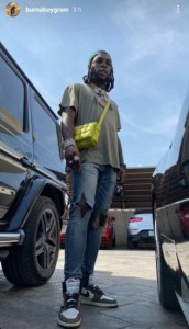 Grammy award-winning Nigerian singer, Burna Boy, stepped out rocking a Bottega Veneta bag. The bag is designed for females but Burna rocked the bag effortlessly. He strapped it across his shoulder as he posed for some photos which he shared on his Instastorie