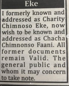 “I formerly known and addressed as Charity Chimnonso Eke, now wishes to be addressed as Chacha Chimnonso Faani. All former documents remain valid. the general public and whom it may concern should take note.”
