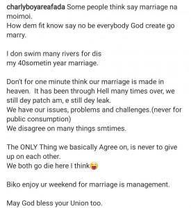 Don’t for one minute think our marriage is made in heaven. It has been through Hell many times over, we still dey patch am, e still dey leak.