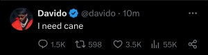 In another post, Davido wrote, “I need cane,” a cryptic statement that has since stirred various interpretations from fans and followers.