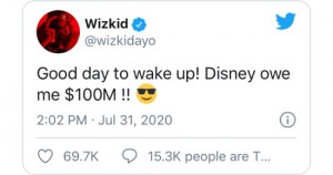 Wizkid tweeted saying, “Good day to wake up! Disney owe me $100M !! 😎” and this is the tweet that has got many asking and wondering what is really going on.