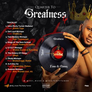 Professional Gbedu Deejay, Dj Muse finally released the anticipated Mixtape EP first ever featured Naija celebrities and next rated artiste in Nigeria. The Mix EP titled “Quarter To Greatness”.