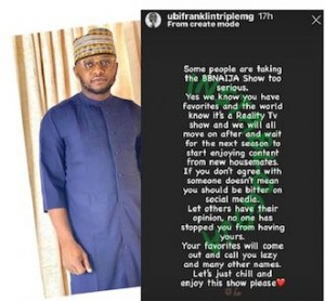 Ubi Franklin who advised against getting bitter and fighting over one housemate or the other, added that these same housemates they are fighting for will still be the ones to call them lazy when they come out of the house.