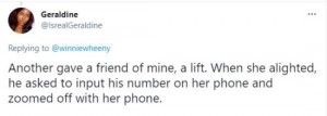 “Another gave a friend of mine, a lift. When she alighted, he asked to input his number on her phone and zoomed off with her phone.”
