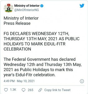 10 thoughts on “Eid-ul-Fitri: FG declares Wednesday, Thursday public holidays”