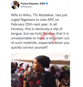 Reacting to the video, the spokesperson for the APC Presidential Campaign Council, Festus Keyamo said it was obvious Mrs. Abubakar suffered a slip of tongue.