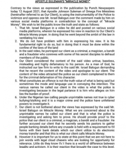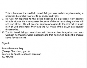 Amune said Balogun is being asked to prove that Suleman is a criminal, magician, bandit and a fraudster as he claimed. He also stated that the YouTuber is being asked to prove that the General Overseer of the Omega Fire Ministries International sends his Pastors to gather people’s account number before any crusade and engaging in electronic money transfer, claiming it is “miracle money”.