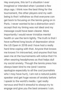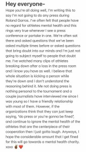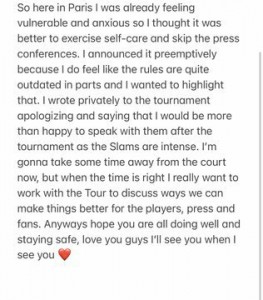 She went on to say that her decision “is nothing personal to the tournament and a couple of journalists have interviewed me since I was young so I have a friendly relationship with most of them. However, if the organizations think that they can just keep saying ‘do press or you’re gonna be fined,’ and continue to ignore the mental health of their athletes that are the centrepiece of their cooperation then I just gotta laugh.”
