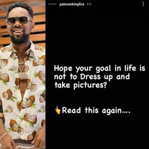 Taking to his Insta-story, Patoranking wrote: ‘‘Hope your goal in life is not to Dress up and take pictures?”