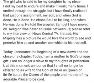 “At this moment, I announce that I shall no longer be referred to as wife to the Ooni of Ife or as Queen of Ile-Ife,” she wrote.