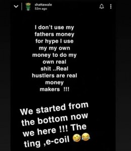 Shatta Wale took to his Instagram Stories and wrote: “I don’t use my father’s money for hype I use my own to do my own real sh*t…Real hustlers are real money makers”