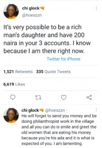 “It’s very possible to be a rich man’s daughter and have 200 naira in your 3 accounts. I know because I am there right now.