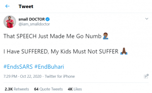 Small Doctor revealed that Buhari’s speech immediately made him numb. According to him, he has suffered, so his kids must not suffer.