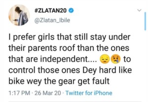 The zanku music boss, Zlatan has had the backlash of his life all because of his recent tweet about him preferring ladies that still stays with their parents.