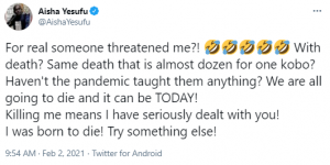 ”For real someone threatened me?! With death? Same death that is almost dozen for one kobo? Haven’t the pandemic taught them anything? We are all going to die and it can be TODAY! Killing me means I have seriously dealt with you! I was born to die! Try something else!”