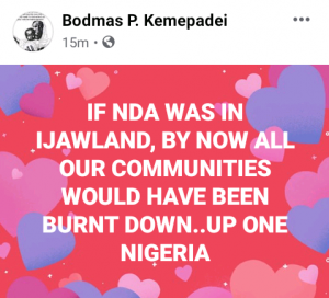 “If NDA was in Ijawland, by now all our communities would have been burnt down. Up one Nigeria.” he wrote.