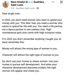 Taking to his Facebook page to advise men on New Year’s Day, Reno Omokri wrote;