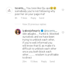 “Ode odugbo….. Funke & I blocked ourselves and we have been trying to unblock each other, if you’re well informed you well know that IG as made its difficult to unblock each other each other once you both block each other… wisdom is profitable to direct”.