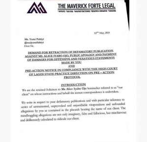 They also demanded that he desists from making further “additional or fresh defamatory publications” against Iyabo Ojo.