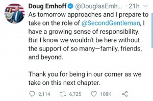A day before inauguration day, Emhoff took to Twitter to write: “As tomorrow approaches and I prepare to take on the role of @SecondGentleman, I have a growing sense of responsibility. But I know we wouldn’t be here without the support of so many—family, friends, and beyond.