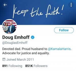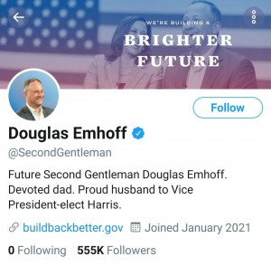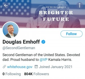 The new account has the Twitter handle @SecondGentleman and the bio has just been changed to read: “Second Gentleman of the United States. Devoted dad. Proud husband to @VP Kamala Harris.”