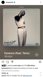 American rapper, record producer, and fashion designer Ye, commonly known as Kanye West, took to his Instagram page to declare Wizkid and Tem’s ‘Essence’ as the best song in the history of music till date.