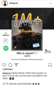 Housemate of ongoing BBNaija season 5 edition, Laycon‘s EP “Who Is Laycon” has garnered 1 million streams across several music streaming platforms.