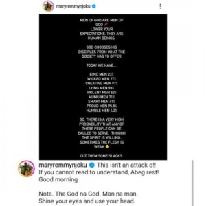 Lower your expectations on Men of God. They are human beings – Actress Mary Njoku advises January 28, 2023 For Online PR / Hype / Music Promotion Call 08074130688 Follow @TrendJamz Actress Mary Njoku has advised people to lower their expectations of men of God as they are human beings as well. In a post shared on her page this morning, the mum of three pointed out that people should learn to cut clergymen some slack. Read her post below.. Entertainment & GistMary Njoku - by Yung Zeelee