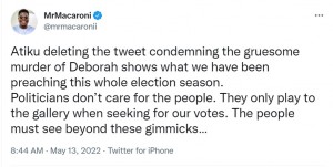 “Atiku deleting the tweet condemning the gruesome murder of Deborah shows what we have been preaching this whole election season. Politicians don’t care for the people. They only play to the gallery when seeking for our votes. The people must see beyond these gimmicks…”