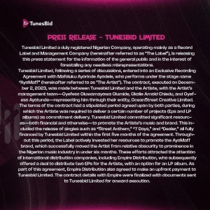 “The contract Elias with Empire were finalized with documents sent to the Tunesbid Limited for onward acceptance. However, unbeknown to the Label, Mafoluku Ayorinde (AyoMaff) and his management team; Oyefeso Oluwamayowa Olumide, Okolie Arnold Chieuci and Oyefeso Ayotunde had continued conniving to deceive and defraud Tunesbid Limited by entering a dishonourable contract with the label, which they had no intention of honouring.