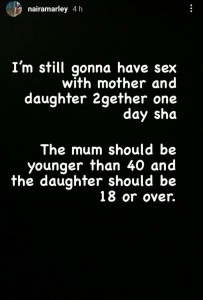 He wrote: “I’m still gonna have sex with mother and daughter together one day sha.