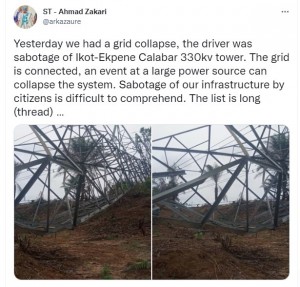 Yesterday we had a grid collapse, the driver was sabotage of Ikot-Ekpene Calabar 330kv tower. The grid is connected, an event at a large power source can collapse the system. Sabotage of our infrastructure by citizens is difficult to comprehend. The list is long.